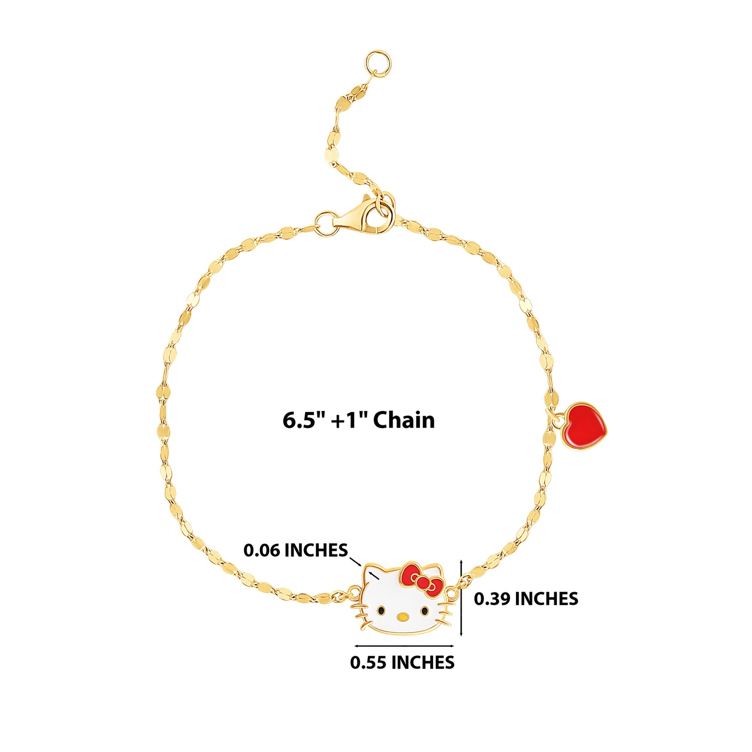 Officially Licensed Hello Kitty Jewelry: Sanrio bracelets for lovers of Hello Kitty. Gold bracelet features an enamel-plated Hello Kitty pendant with a red bow. Dangle charm of a red enamel heart also accents the bracelet for a cute finish.