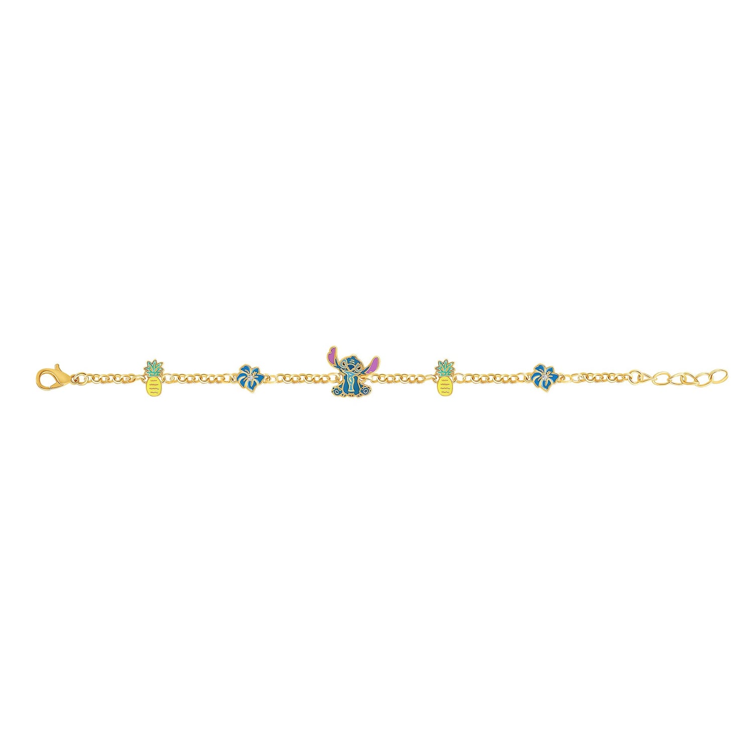Presenting the Disney women's Stitch bracelet with station pendants - an officially licensed piece of gold-flash plated Stitch jewelry that allows you to showcase your adoration for Stitch in style. This fun, fashionable bracelet boasts a central enamel-flash plated Stitch pendant, serving as a heartfelt tribute to the beloved character. Encircling the bracelet are two charming blue flower and two pineapple station pendants, adding a vibrant and animated dimension to its design. Crafted from yellow gold-flash plated brass, the Stitch bracelet measures 6.5 inches in length and includes an additional 1-inch extender, ensuring an adjustable fit that suits your preference. With this enchanting accessory, you can effortlessly incorporate the whimsy and charm of Stitch into your everyday ensemble