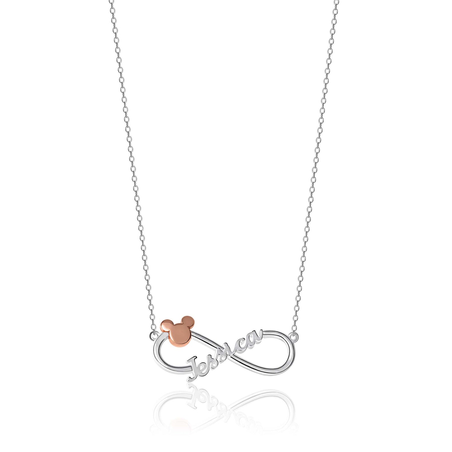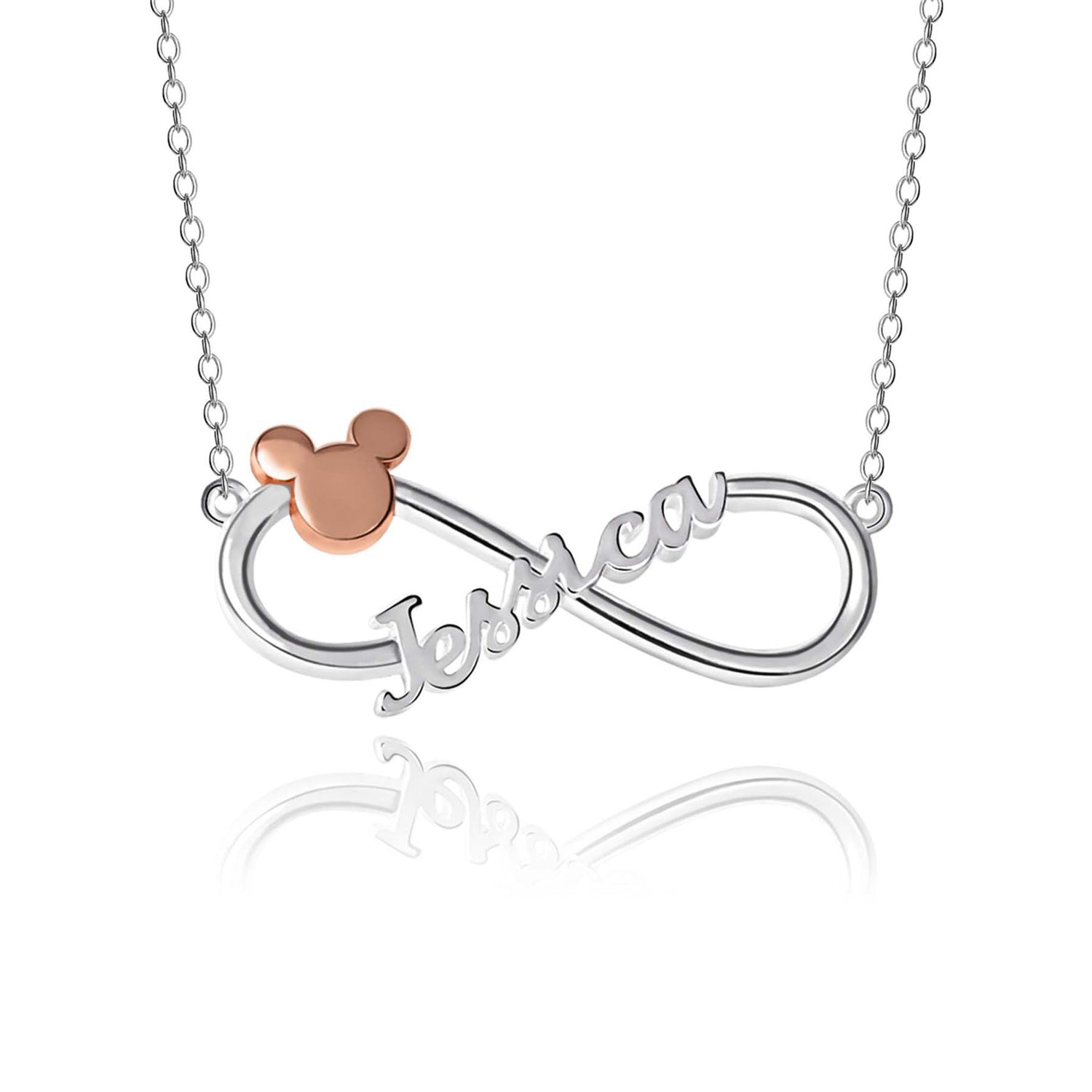 For that special someone who deserves their name to have a touch of Mickey Mouse charm, here's a gleaming, polished sterling silver infinity personalized necklace to give as a Disney memento!