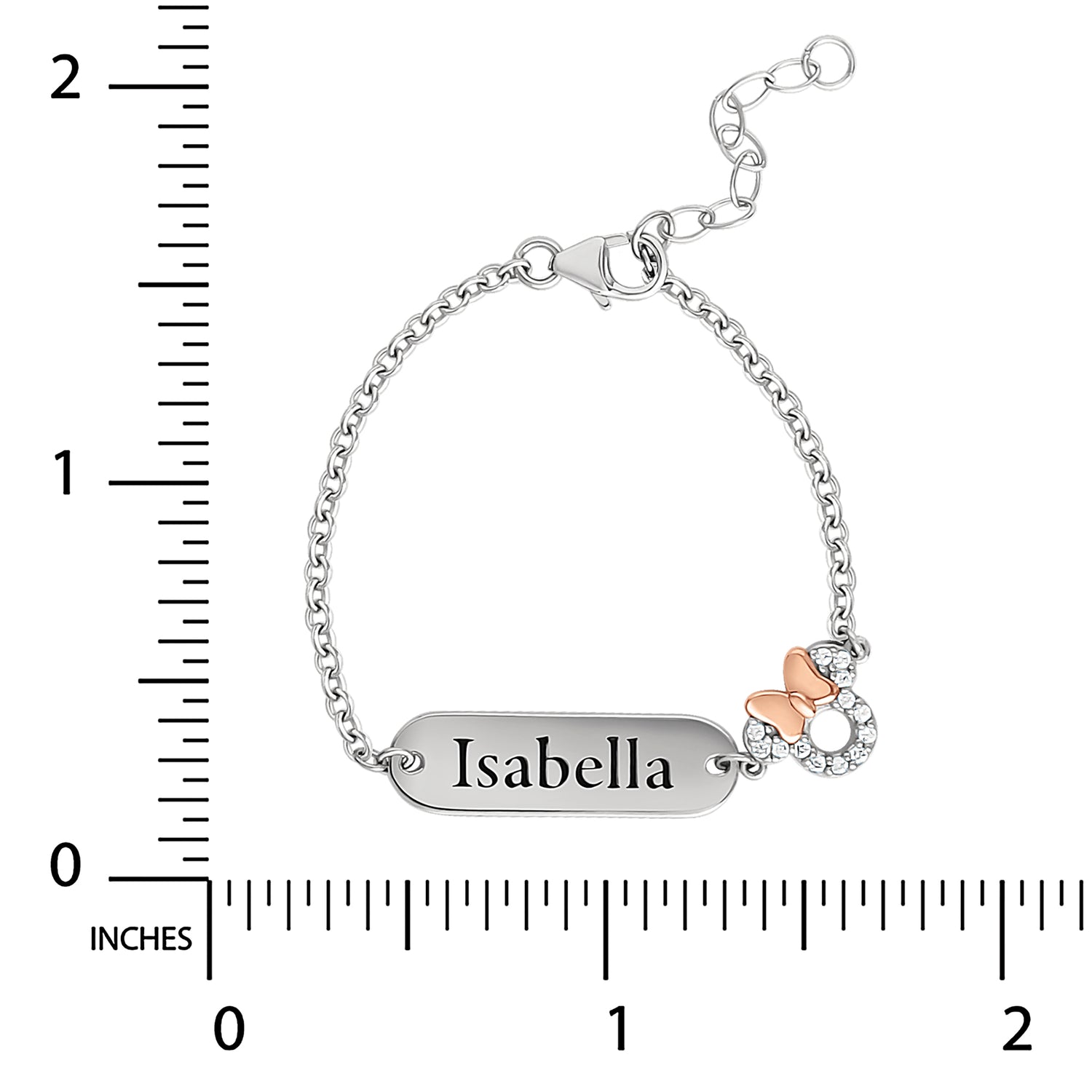 Get personal with this Minnie Mouse Personalized Bracelet. Playful and chic, Minnie Mouse wins at personalization and elegance with this sterling silver necklace featuring a whimsical enamel charm connected to the name flash plated.