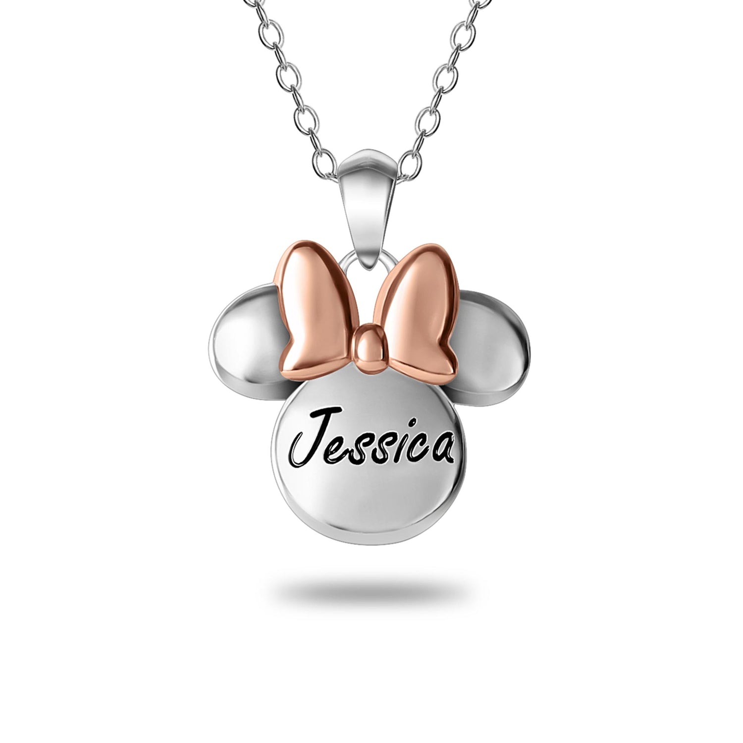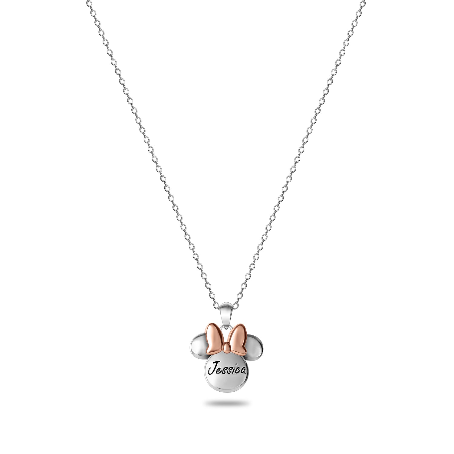 This beautiful necklace is a magical personal choice that would make an excellent gift! Crafted in polished sterling silver, a name of your choice is spelled out in lovely script type that's engraved on the adorable charm of a Minnie Mouse pendant for a Disney touch.