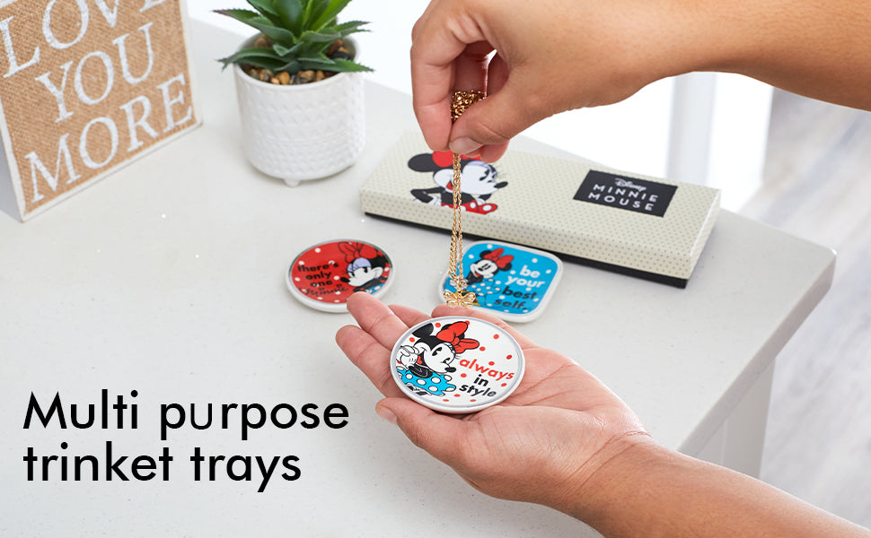 - BRING THE MAGIC OF DISNEY HOME; 3 Piece set includes Minnie "always in style"dish, "be your best self"dish, and "there's only one Minnie" dish