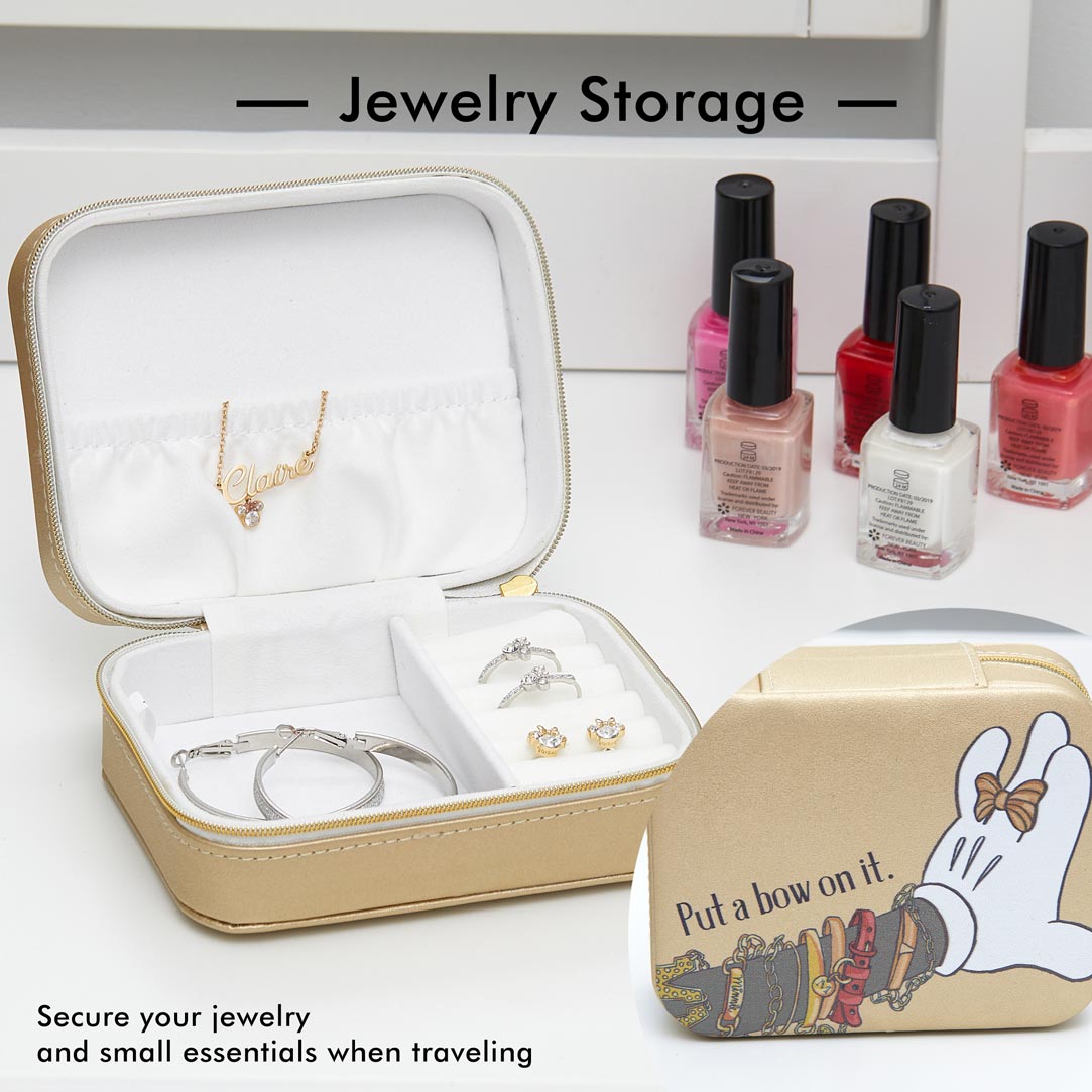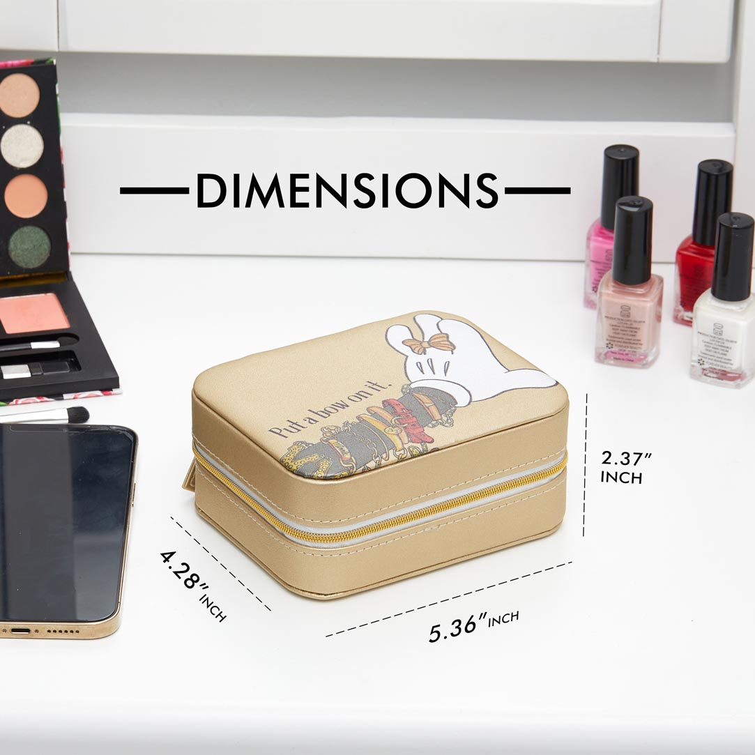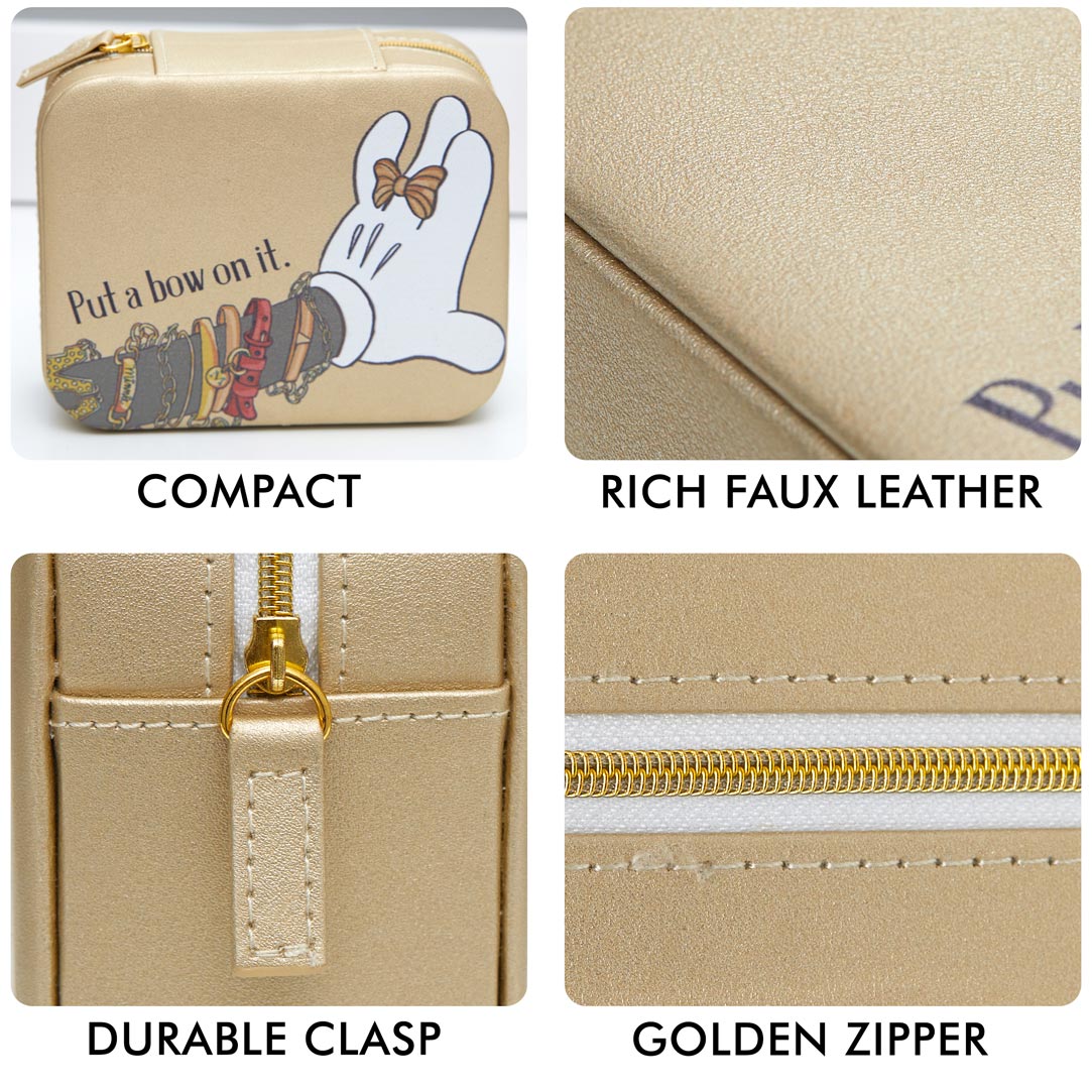 Fabilous jewelry organizer in golden matte with "Put a bow on it" and Minnie showcasing her signature bow as a ring: cute and practical compact storage, great for organization and travel; measures 4" x 5" x 2.25" with a secure zip around closure, ivory flocked inner lining, multi compartments and an elastic interior pocket; ideal for rings, earrings, necklaces, bracelets and anklets