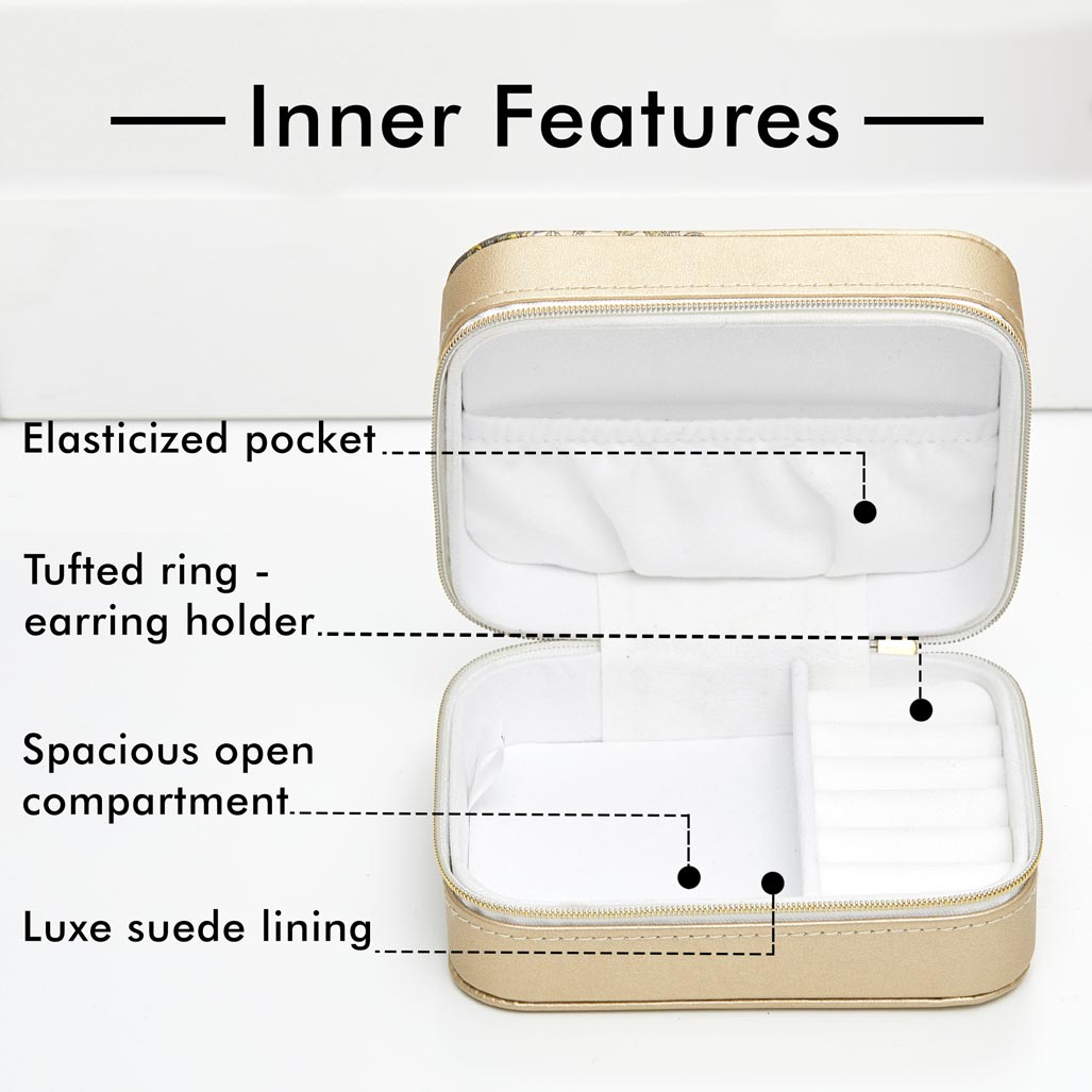 - CUTE AND PRACTICAL COMPACT STORAGE great for organization and travel; measures 4" x 5" x 2.25" with a secure zip around closure, ivory flocked inner lining, multi compartments and an elastic interior pocket; ideal for rings, earrings, necklaces, bracelets and anklets