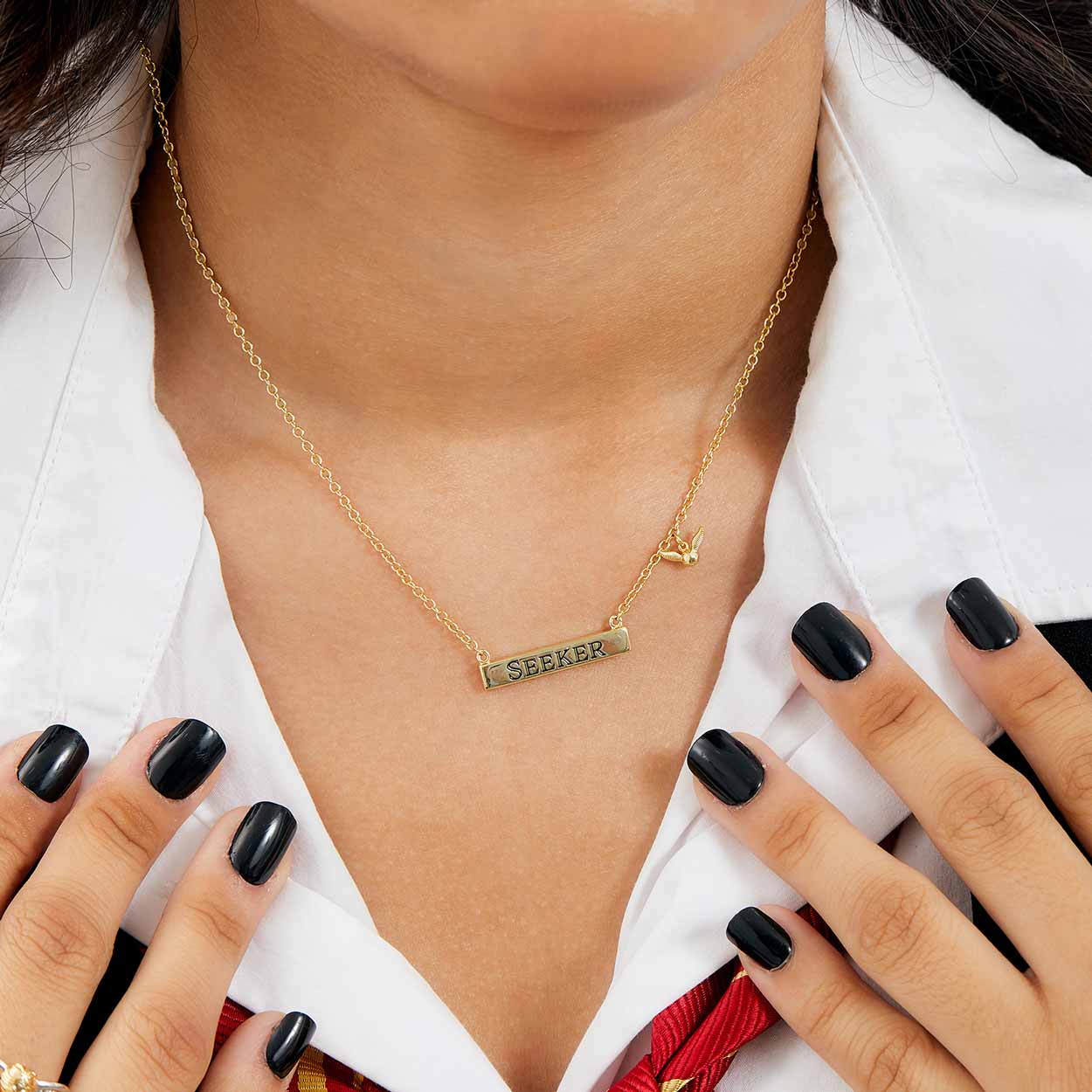 Calling all Quidditch enthusiasts... The captivating Harry Potter Seeker Bar Necklace captures your style along with the prized Golden Snitch! The spellbinding design with SEEKER embossed on an elegant gold bar is perfect for Harry Potter fans. A petite Golden Snitch charm dangling from the chain completes the look that's sure to cast a spell of fun on every day! Makes a great gift for Harry Potter fans and an awesome treat for yourself!