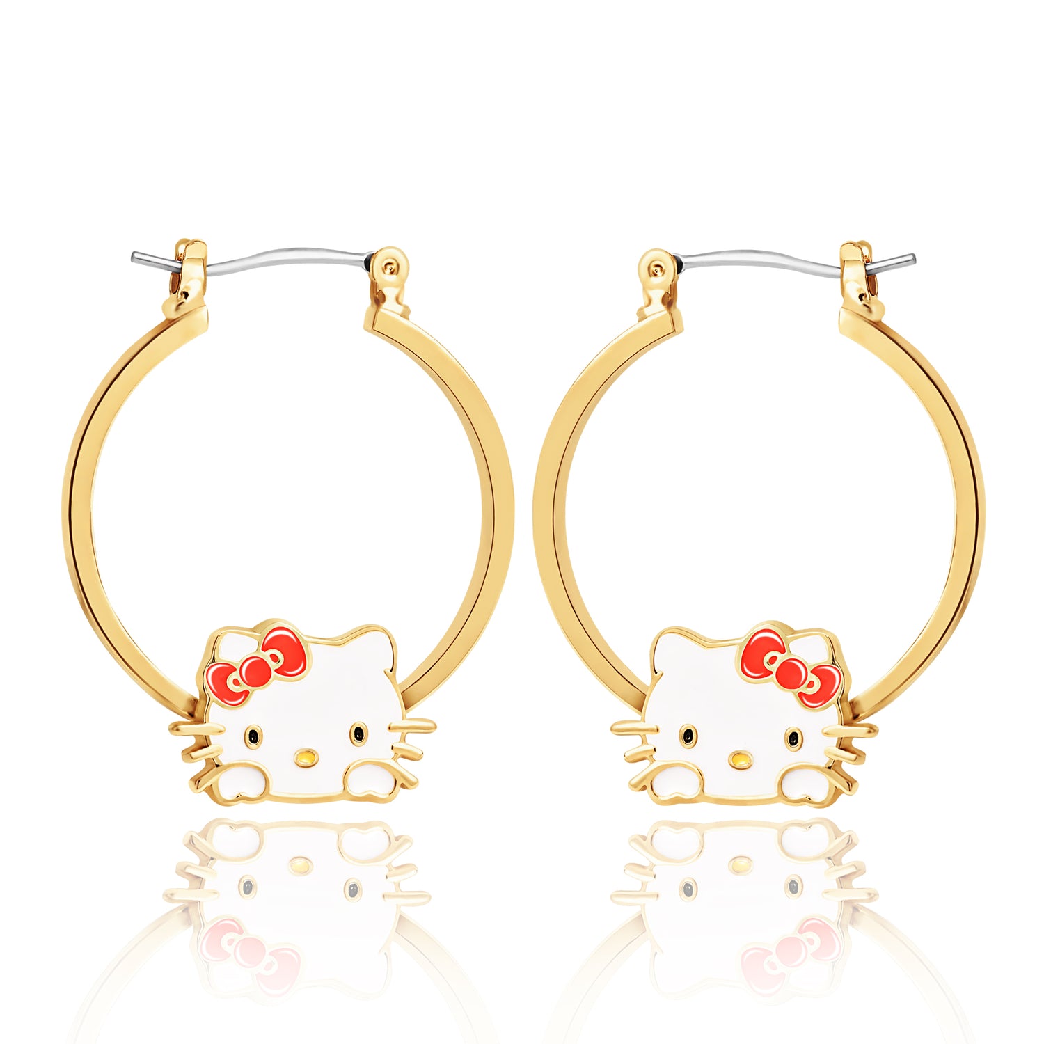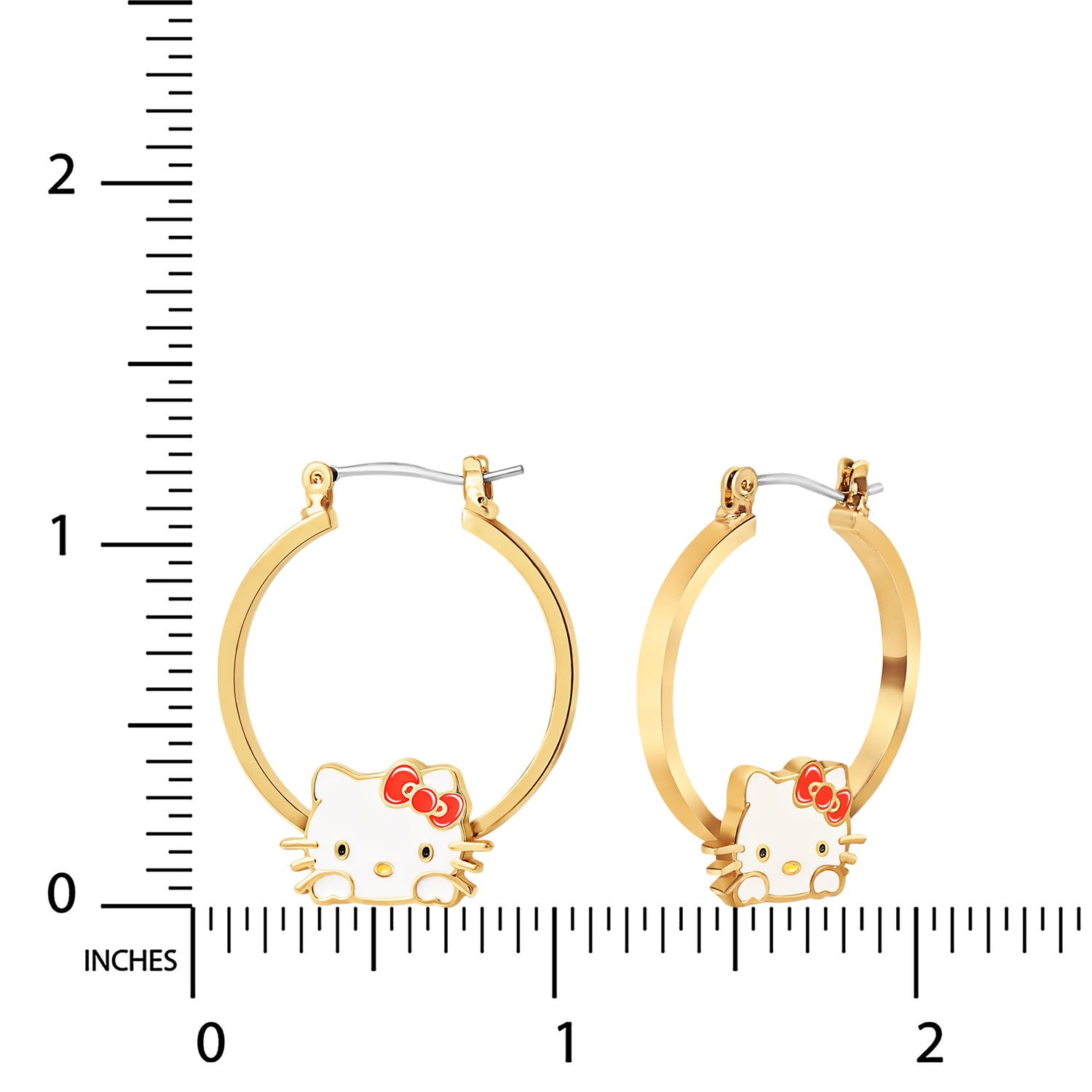 Upgrade your gold hoop earring game with these stylishly sweet Hello Kitty hoop earrings. These adorable earrings are flash plated yellow featuring the classic Hello Kitty face at the bottom of the hoop in multicolored enamel