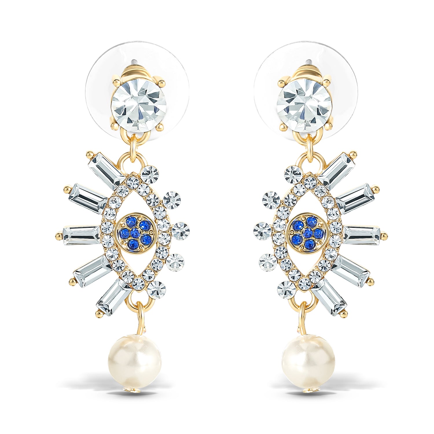 Encourage Good Energy: Wear a sparkly lucky charm in your ears with these becoming evil eye earrings. Gold dangle earrings are encrusted with clear rhinestones, a blue rhinestone "iris" at center, and dangling faux pearl finish.
