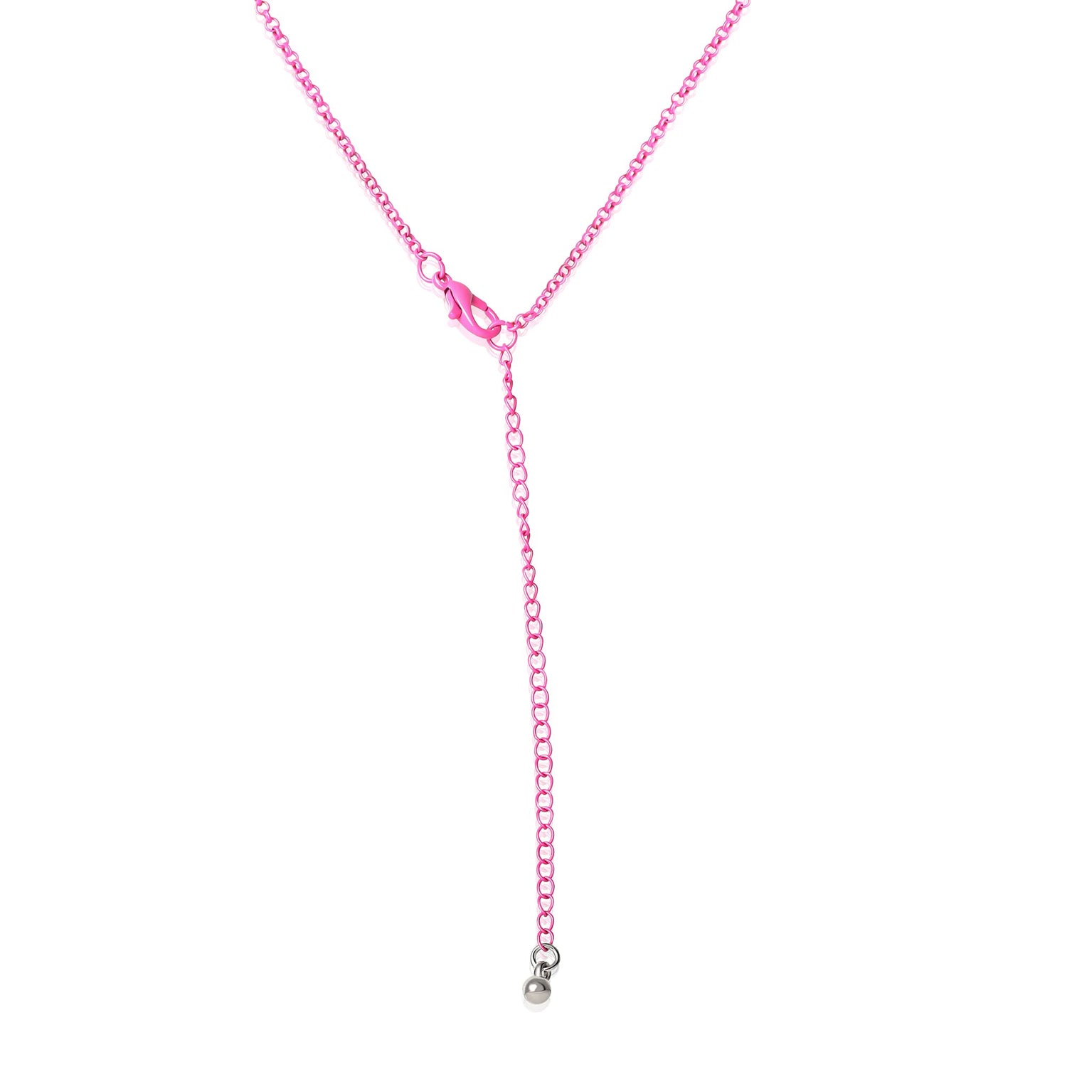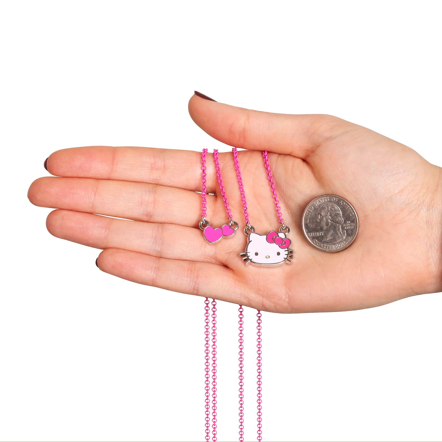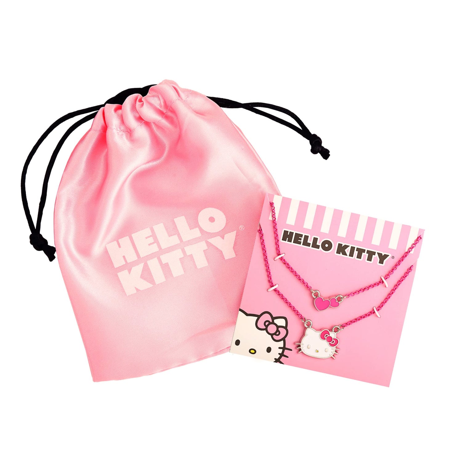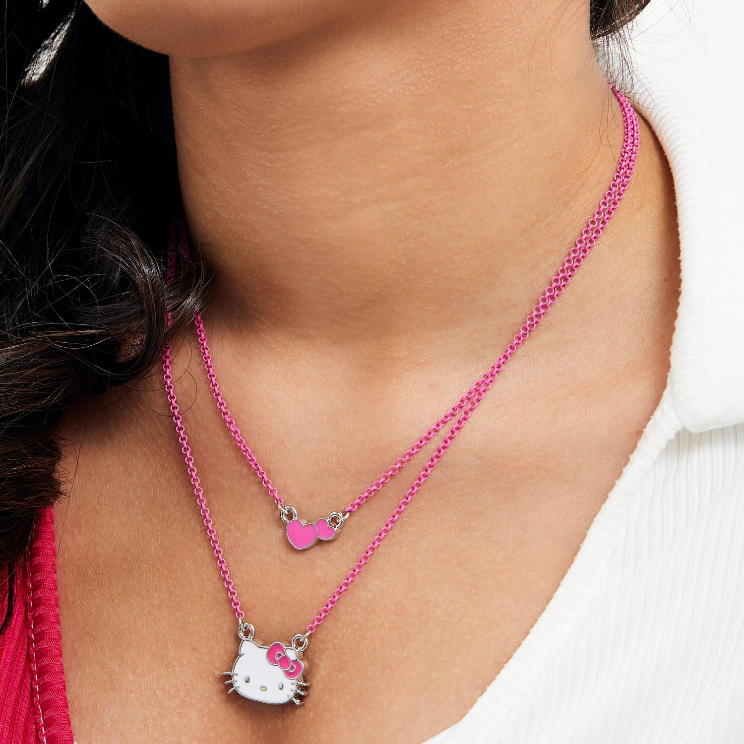 •A Hello Kitty jewelry treat, this necklace features two connected pink necklaces for variety in wear. One pendant has a pink enamel hearts and the other has a white, pink, and yellow enamel Hello Kitty.