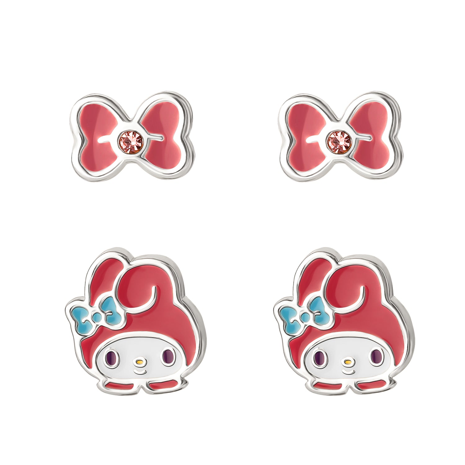 Sanrio Hello Kitty Brass Flash Silver Plated Bow and Melody Pink Crystal Stud Earrings