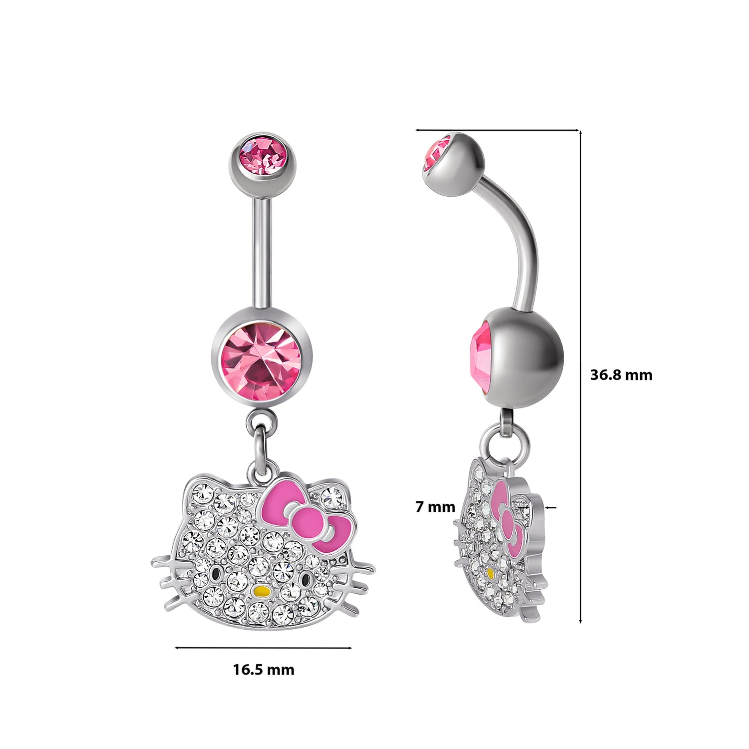 Introducing the Official License Hello Kitty Belly Piercing Jewelry, a 14g belly button ring crafted from Stainless Steel (316L) Piercing element with Brass Dangle. The belly ring features beautiful crystal accents and a dangling Hello Kitty charm with enamel plating that provides pops of color. Hello Kitty belly rings come with a 5m ball at the end for a secure fit.