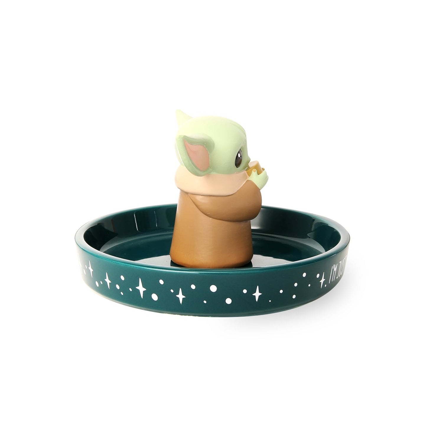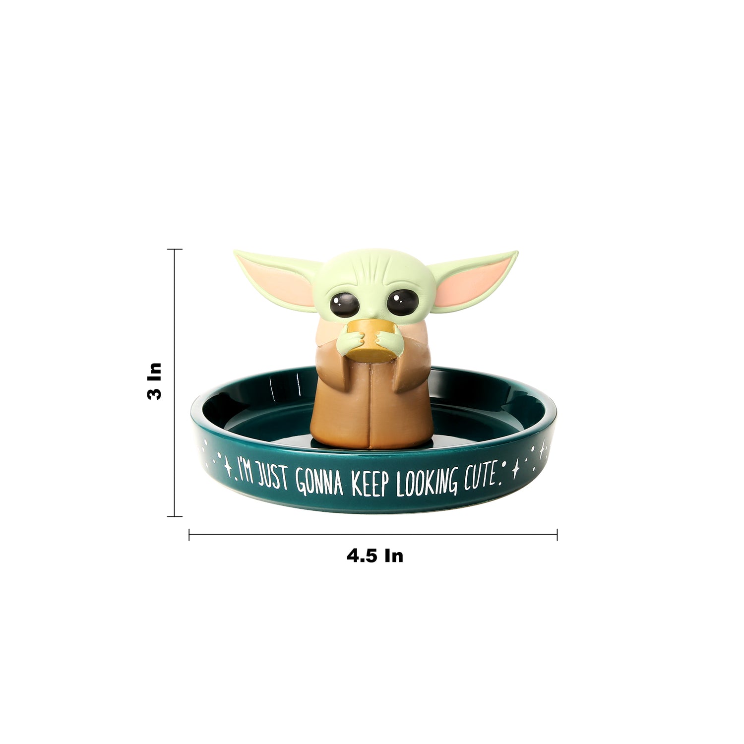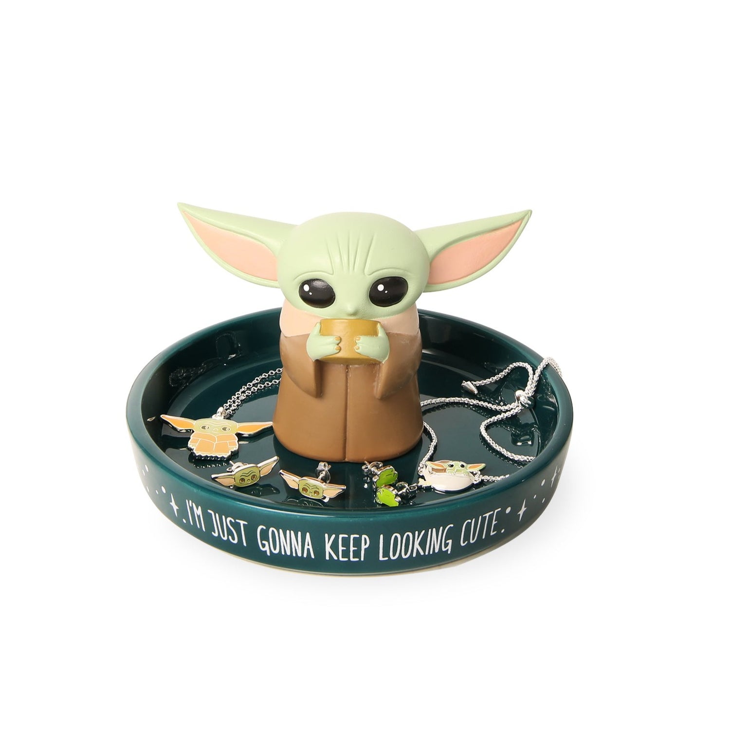 A catchall dish for Star Wars fans young and old, this jewelry tray features a cute 3D figure of Grogu from The Mandalorian. Stars and "I'm Just Gonna Keep Looking Cute" enliven the green ceramic trinket tray exterior. A thoughtful and useful gift for Mandalorian fans to place their earrings, rings, and other Star Wars jewelry upon. Decorative jewelry dish looks divine on a nightstand, desk, dresser, or vanity. Jewelry not included